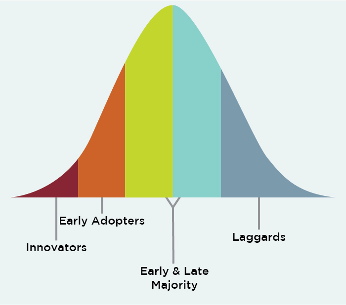 Who in this chart do you think might reshare your content or link to it? It's certainly not the laggards, or even the early or late majority. Generally speaking, these are not the people with large social media followings, or highly popular blogs or columns on your market. The people who do have these things are highlighted here: