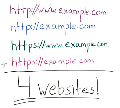 You have to make sure that you are forcing all of these different versions of your domain to resolve to one version of your domain. For me, I'm pretty agnostic as to which version you pick. You should probably already have a pretty good idea of which version of your website is the real version, whether that's www, non-www, HTTPS, or HTTP. From my view, what's most important is that all four of these versions resolve to one version.