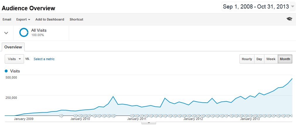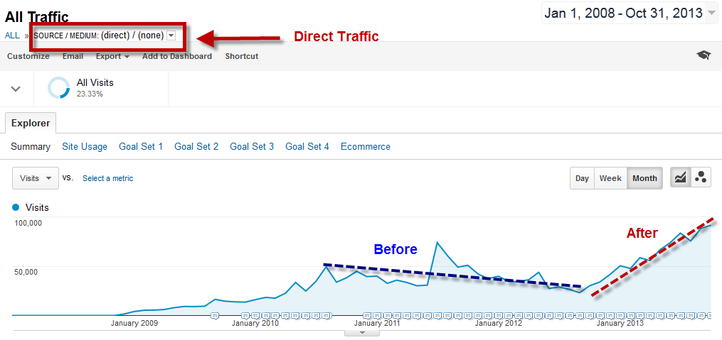 One of the biggest issues I had was poor brand recall - that a measly 3% of my organic searches were branded searches. Unfortunately, the whole keyword (not provided) mess makes it pretty much impossible to trend this branded searches over time [shakes fist at Google], however a proxy for brand recall is direct traffic. Meaning, to the extent that you're building your brand, you would expect more people to visit your website directly, as opposed to stumbling upon your SEO'ed content. Here's what my direct traffic looks like over last 6 years.