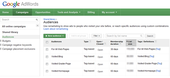 In remarketing, you usually need to create different audiences to remarket so you can adjust your bidding strategy and your ads. For example, we created one audience for people who visited our blog, one for home page visitors and another for people who visited one of our free tools (e.g.: Our Google AdWords Grader for PPC auditing). We can assume each of these high-level groups was looking for different types of information.