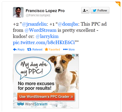 Lousy ads have sunken many remarketing efforts, so the key is to keep A/B testing with different ad designs. You want to have a high CTR (ideally more than 0.4%) and find the most memorable copy and image combinations, since one of the objectives here is to improve brand recall. You know you have finally "made it" when you get people tweeting your ads! Like this cute little puppy dog!