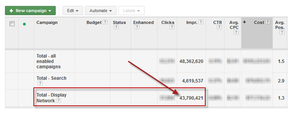Basically, we buy a truckload of impressions ever month. Around 44 Million of them per month—take a look below—I allocate my PPC budget 50/50 between search and display remarketing.