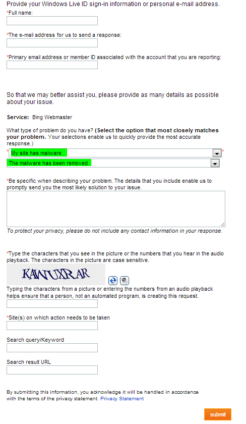 Now that the site was clean, I logged into Bing Webmaster Tools and completed a Malware Re-Evaluation Form http://www.bing.com/webmaster/help/malware-re-evaluation-e6982183. This process is fairly straight forward, and requires some basic information including:
