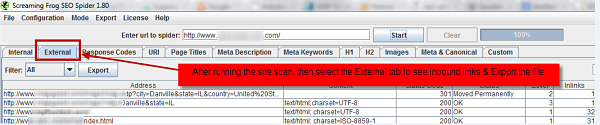 Use scanning software, such as Screaming Frog http://www.screamingfrog.co.uk/ or Xenu Link Slueth http://home.snafu.de/tilman/xenulink.html to identify the site’s external links.