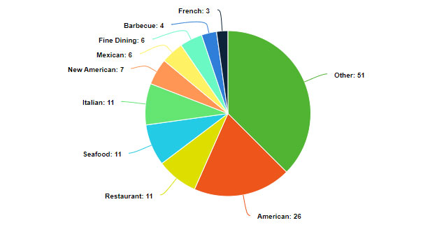 Instead, what we’ve discovered is that restaurants of every category can make it into the top 3. Fifty-one percent of the ranking restaurants hailed from highly diverse categories, including Pacific Northwest Restaurant, Pacific Rim Restaurant, Organic, Southern, Polish, Lebanese, Eclectic and just about every imaginable designation. American Restaurant is winning out in bulk with 26 percent of the take, and an additional 7 percent for New American Restaurant. I find this an interesting commentary on the nation’s present gustatory aesthetic as it may indicate a shift away from what might be deemed fancy fare to familiar, homier plates.