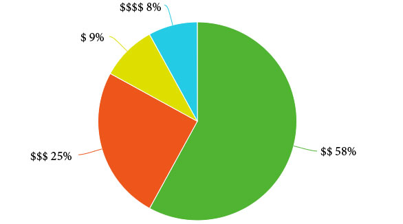 Fifty-eight percent of the top ranked restaurants for our search have the $$ designation and another 25 percent have the $$$. We don’t know Google’s exact monetary value behind these symbols, but for context, a Taco Bell with its $1–$2 entrees would typically be marked as $, while the fabled French Laundry gets $$$$ with its $400–$500 plates. In our study, the cheapest and the costliest restaurants make up only a small percentage of what gets deemed “best.”