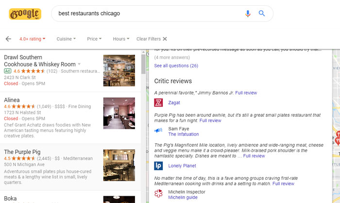 I’ve always wanted to investigate critic reviews for restaurants, as Google gives them a great deal of screen space in the listings: