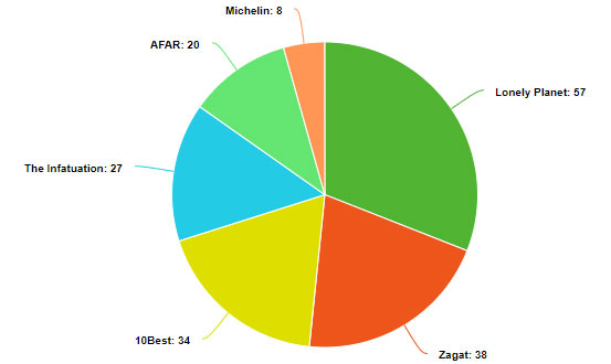 With 57 appearances, Lonely Planet is the leading source of professional reviews for our search term, with Zagat and 10Best making strong showings, too. It’s worth noting that 70/150 businesses I investigated surfaced no critic reviews at all. They’re clearly not a requirement for being considered “best”, but most restaurants will benefit from the press. Unfortunately, there are few options for prompting a professional review. To wit: