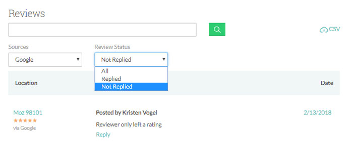 The screenshot, above, is taken from the Moz Local dashboard. If you’re a customer, just log into your Moz Local account and go to your review section. From the “sources” section, choose “Google” — you’ll see the option to filter your reviews by “replied” and “not replied.” You’ll instantly be able to see which reviews you haven’t yet responded to. From there, simply use the in-dashboard feature that enables you to respond to your (or your clients’) reviews, without having to head over to your GMB dashboard or log into a variety of different clients’ GMB dashboards. So easy!