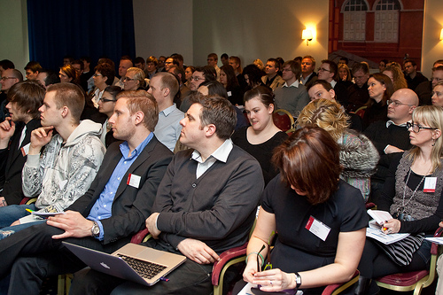 The crowd listens intently during a presentation