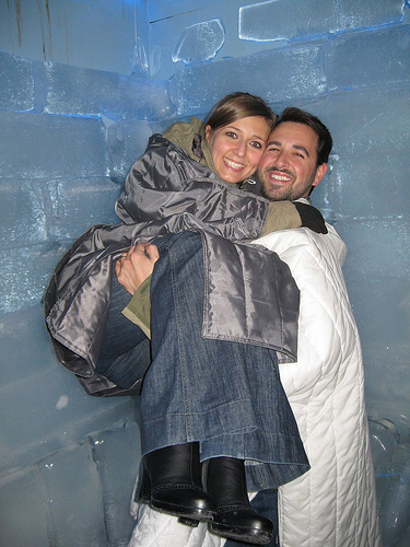 I hoist up my wife for a photo in the glacier-carved ice bar