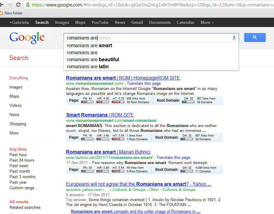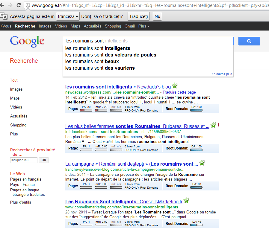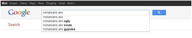 In November 2011, someone noticed that if he typed in Google romanians are (English), romanii sunt (Romanian), les roumains sont (French), los romanos son (Spanish), i rumeni sono (Italian), rumanen sind intelligent (German) the Autocomplete gave only negative suggestions.