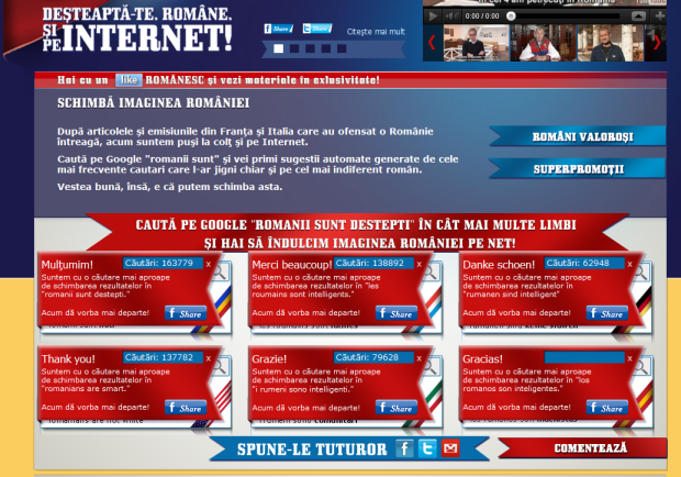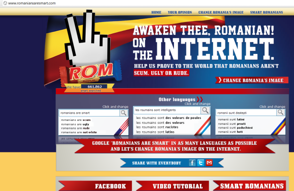 Starting from this, one of the most well knows Romanian brands, ROM, launches a campaign to change the Romania's image on Google. They build a website: Romanians are smart (with a Romanian version on Romanii sunt destepti), where they persuade Romanians to search on Google on specific terms, so they will change the Google Autocomplete suggestions. The campaign's call to action is "Change with a click"; users get the option to search directly from the website in six languages: Romanian, English, German, French, Spanish, Italian with the final goal of changing the Romania's image on Internet: