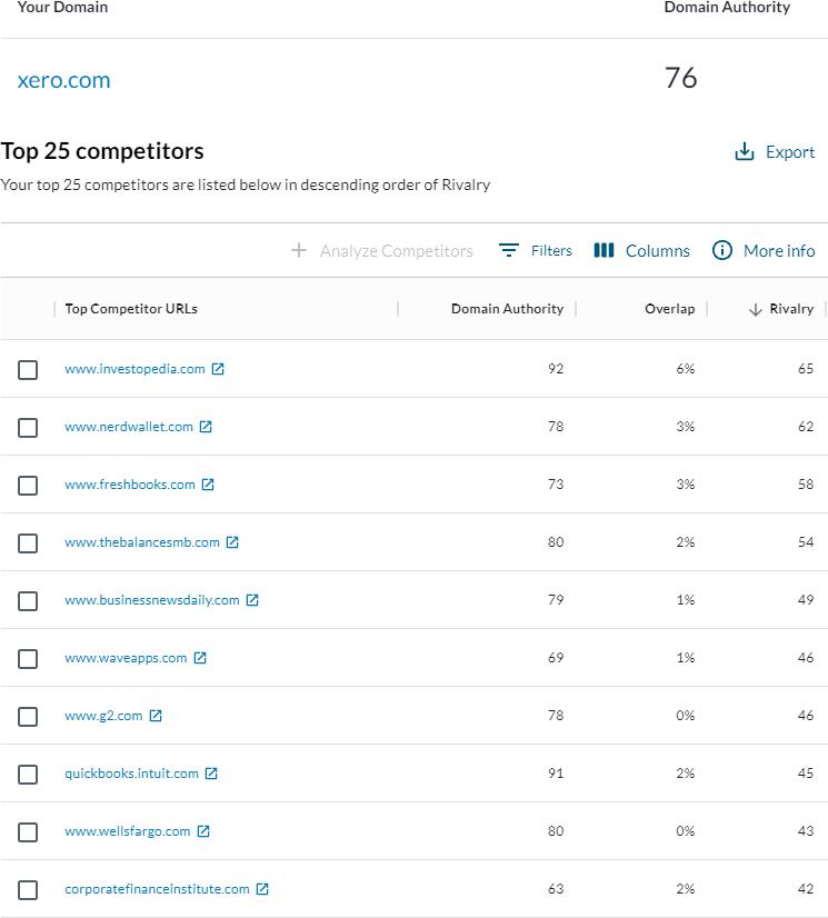 For reference, we’ve got the Domain Authority (DA) of Xero.com and the DA, keyword Overlap, and Rivalry (a Moz metric that balances three factors, including DA and Overlap) of each of the top 10 organic search competitors. I can quickly spot a couple of things: