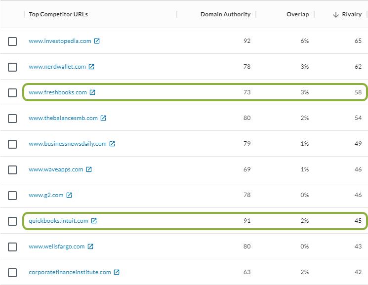 FreshBooks and QuickBooks immediately stand out as familiar brands in the accounting software space, and FreshBooks is in a very similar DA range. These are very likely product competitors and give us a talking point during the call. In addition, note these competitors: