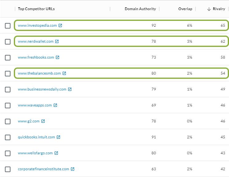 These are content competitors that have significant overlap with Xero and are competing for organic traffic. Our prospect may not think of NerdWallet (just to pick one) as a competitor, but their content could provide key insights into questions potential buyers are asking.