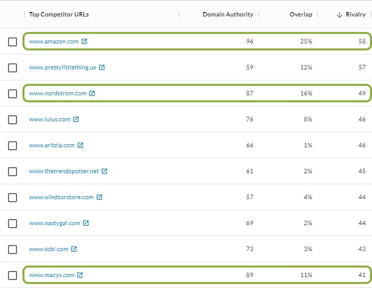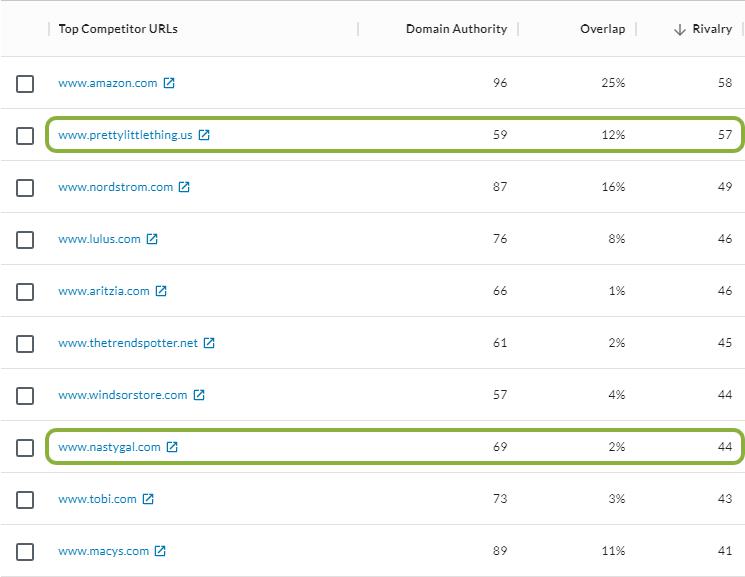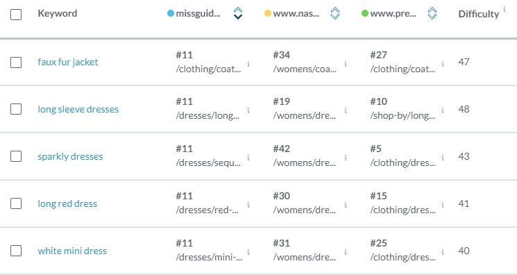 I’ll skip right to the insights (note that MissguidedUS.com has a DA of 64). I can see right away that Missguided is up against some big players in the retail space, including high-end department stores and Amazon. These competitors are aspirational and might not be a realistic focus, but this is a great topic for conversation. Who do they aspire to compete against and how do they face the reality of being in a market with these big players?