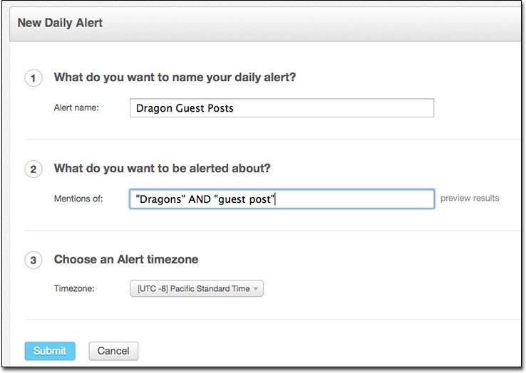 For example, let's say your subject is "dragons" and you want to find blogs that have posted guest posts in the past few days. You can simply create an alert for "dragons" AND "guest post".