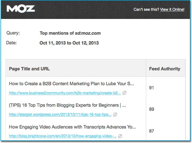 With this alert set, every day I would get a new Fresh Alert in my inbox with a list of mentions. Looking at the number of non-linking mentions above, I'd better get link building!