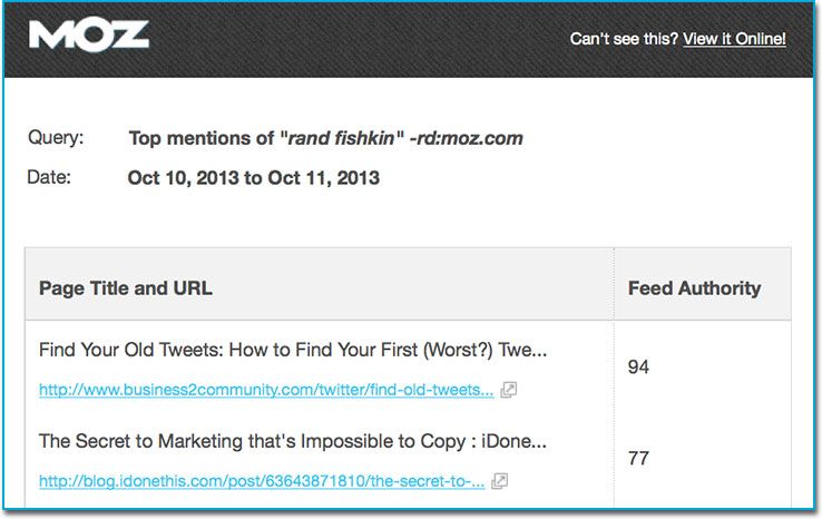 - One Fresh Alert notified me whenever people mentioned "Search Engine Ranking Factors" but didn't link to Moz
