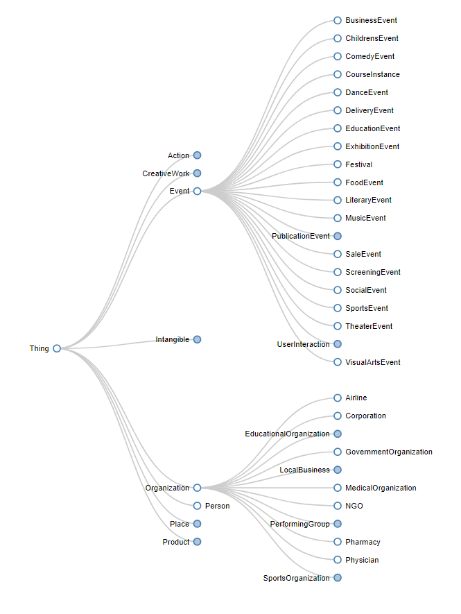 At the highest level of most Schema.org item types is Thing (alternatively, we’d be looking at DataType). This intuitively makes sense because almost everything is, at its highest level of abstraction, a Thing. The item type Thing has multiple children, all of which assume Thing’s properties in a cascading in a hierarchical fashion (i.e., a Product is a Thing, both can have names, descriptions, and images).