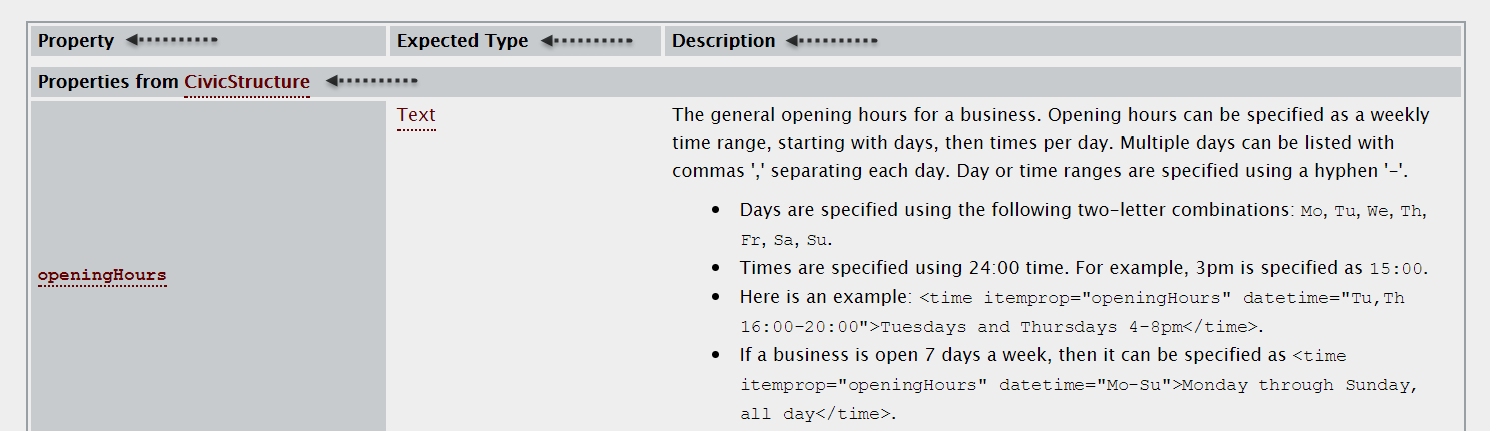 - Note: Google’s documentation uses the openingHoursSpecification item property, which nests OpeningHoursSpecification. This is a good example where Google documentation shows a more specific experience to consider.