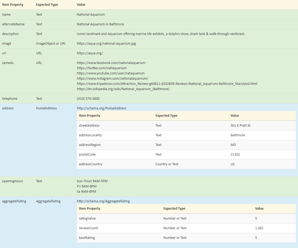 - After looking at the documentation, openingHours, address, aggregateRating, telephone, alternateName, description, image, name, and sameAs (social media linking item property) stood out as the most cogent and useful for aquarium goers. In an effort to map out all of the information, I added the “Expected Type” (which will be important in the next step) and the value of the information we’re going to markup.