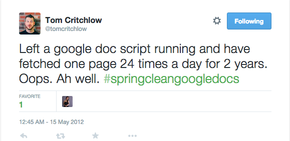 “I’ve lost count of the times when ad-hoc scraping has saved my bacon. There were low-stress times when fetching a bunch of pages and pulling their meta descriptions into Excel was useful, but my favorite example in recent times was with a client of mine who was in talks with Facebook to be included in F8. We were crunching data to get into the keynote speech and needed to analyze some social media data for URLs at reasonable scale (a few thousand URLs). It’s the kind of data that existed somewhere in the client’s system as an SQL query, but we didn’t have time to get the dev team to get us the data. It was very liberating to spend 20 minutes fetching and analyzing the data ourselves to get a fast turnaround for Facebook.” – Tom Critchlow