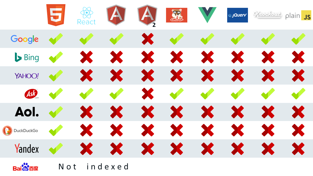 As you can see, Google and Ask are the only search engines to properly index JavaScript-generated content. Bing, Yahoo, AOL, DuckDuckGo, and Yandex are completely JavaScript-blind and won’t see your content if it isn’t HTML.