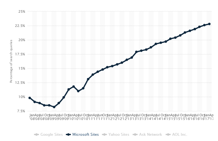 However, Microsoft-owned Bing isn't out of the running. Their growth has been quite aggressive over last 8 years: