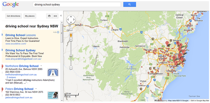 - I typed ‘driving school Sydney’ into Google maps, assuming that most companies will have registered their businesses there, although as a researcher, I know that some may not be on Google maps and there may be missing data. From this query I could see where the driving schools were located and by looking at the clusters it was obvious that there were a couple of areas in the Blue Mountains and the Hills district that did not have much coverage.