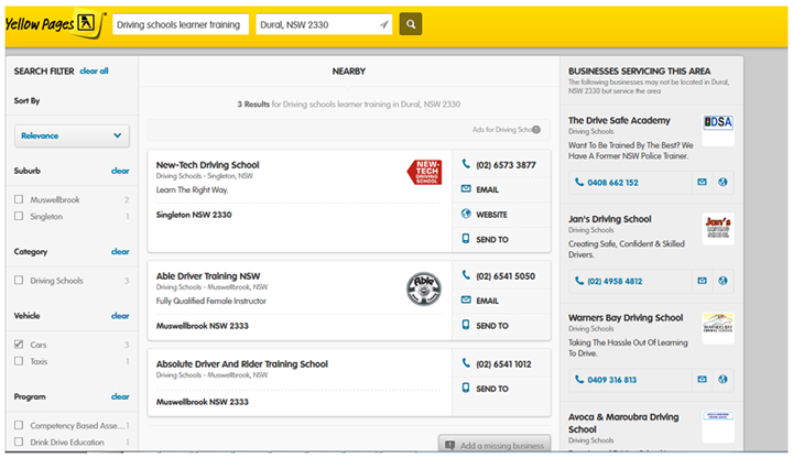 - Just to check to see if the above was accurate, I typed in ‘driving schools Dural’ in Yellow Pages (on-line telephone directory) with this result: