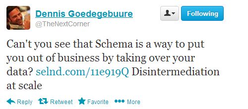 There have been a number of SEOs who raise valid concerns about the implementation of structured data markup. Will it enable scraper sites to easily take your data and use it to outrank you? Or worse, will Google vacuum up your data for its own purposes in Knowledge Graph results or increasingly sophisticated rich snippets? This tweet from Dennis Goedegebuure concisely sums up the latter concern, and it applies to Google, Bing, Facebook, Twitter or any other search engine or social media network: