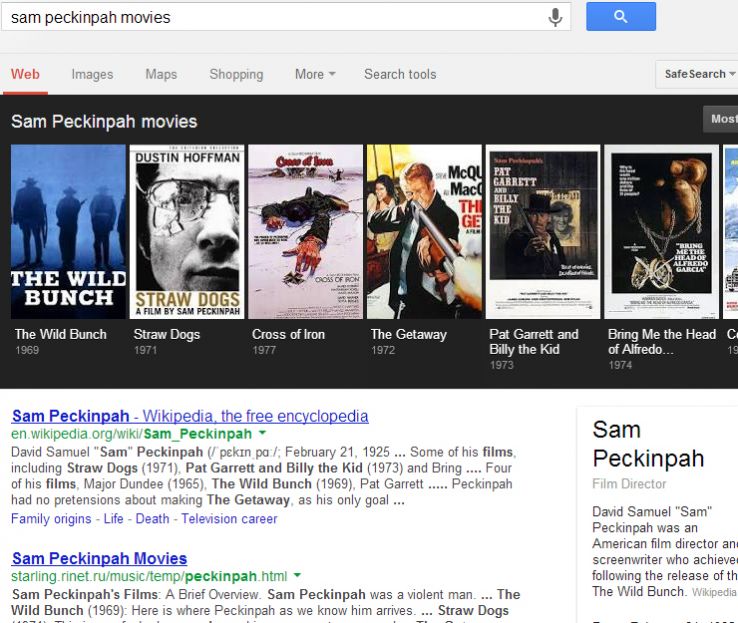 It's obvious that Google's Knowledge Graph result above is generated primarily from the Freebase entry on Sam Peckinpah. The shift that will be much harder to deconstruct will be search results ranking sites that aren't clearly optimizing for specific keyword queries, or may not contain what SEOs would consider strong link profiles with exact- or partial-match anchor text. Consider this result for the classic phrase from the movie 2001: A Space Odyssey: