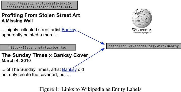 The Google/UMass Wikilinks project provides a good illustration of cross-document co-reference with two web documents that both link to the disambiguated entity 'Banksy' on Wikipedia: