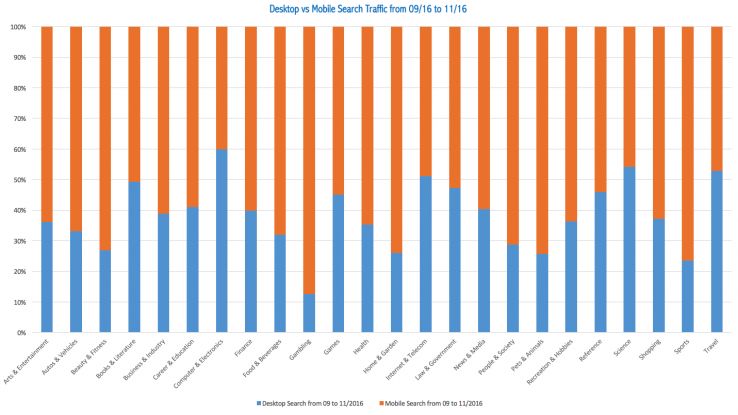 I designed this chart using the search traffic data Similarweb offers us. For all the industries categorized by Similarweb, I took the first five websites per search traffic volume in the USA during last November, and saw for each one of them how much traffic was from desktop and how much from mobile during the past three months.