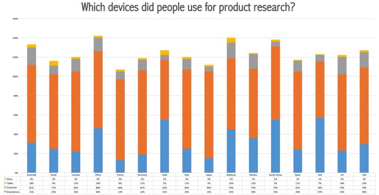 The chart below, based on the same Consumer Barometer with Google data, tells us clearly that desktop is still by far the most-used device for product research (desktop is in orange):