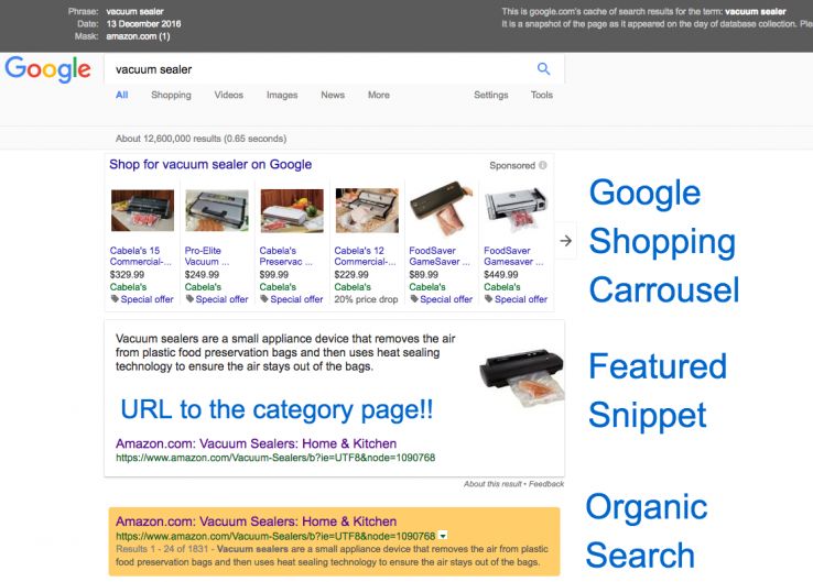 SEMRush SERP snapshot, and an example of how a featured snippet can be generated from an ecommerce category page (the SEO for Amazon must be very happy, I bet).