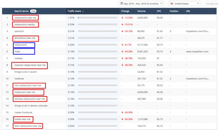 Returning to TripAdvisor as an example, if we look at which queries bring more organic traffic from mobile (and excluding branded searches), we see these: