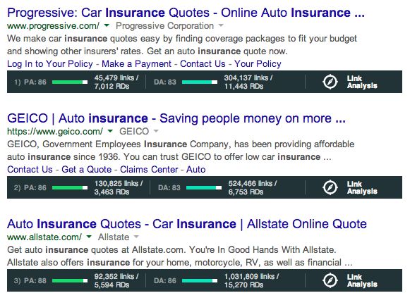 This has been debunked so many times it makes my head swim. That doesn't change how many people still think that the total number of links (as reported by a third party tool like Moz, Majestic, or AHREFs) is the sole factor in ranking. Want to do better in SERPs? Well, we need to hire someone to build us some links! I'm going to leave one screen shot here (Search: "insurance") and then we'll get into resources and solutions for when you have to face this.