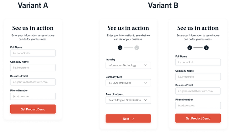 Split testing, sometimes referred to as A/B testing, is the process of testing multiple variants of a web page to determine which one converts at a higher rate. This is a core practice among marketers who specialize in CRO. You can test different types of lead forms, CTA buttons, copy variants, and even page layouts.