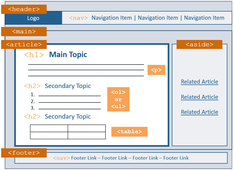 - Use semantic HTML (especially hierarchically organized, relevant <h#> tags and unordered and ordered lists (<ul>, <ol>))