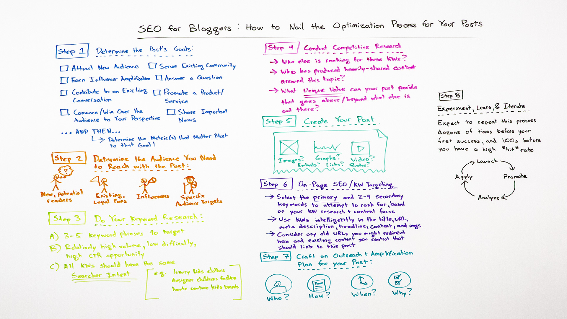 This is not one of those things where I'm going to say, "Oh, you absolutely have to follow this from end to end for every post that you write, and it's a big, formal, complex process." A lot of this can be done in your head before you start writing the post, before you start creating it. That's totally okay. This does not have to add a ton of layers of involvement. But if you use this process as you're creating each post, which I do many, many times for Whiteboard Friday, this blog post that you're reading and watching right now, and for all the posts that I write, it can be hugely helpful and eventually transformative in your ability to get search traffic to your blog.