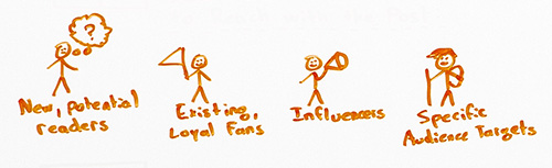 Related, determine the audience you're trying to reach with the post. So that could be potential new readers. It could be existing loyal fans. "Yay," he's waving a flag. It could be influencers, folks who have the ability to broadcast your message, and maybe you're not even trying to attract them to broadcast this particular message, you just want their attention so in the future you can reach them.