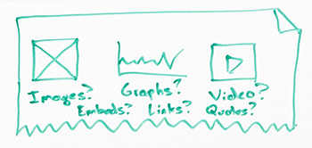 I also want to think about, in here, the types of content that I want. So written content is pretty obvious for most blog posts. But I should also think about things like images and graphs or data, video. Do I want to embed content from other places, maybe SlideShare, or I want to embed some rich media file?