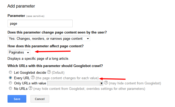 - In Google Webmaster tools, under the Parameter Handling section, set the paginated page parameter to “Paginates” and for Google to crawl “No URLs”. This is another setting that requires extreme caution as parameters can be shared across various sections of the website and may have negative unintended consequences. If you are not confident and comfortable with these settings, leave the setting to "Let Googlebot Decide".