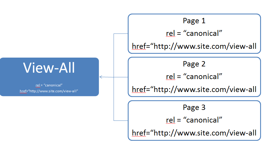 - Once you have created the View-All page, place a rel=”canonical” tag in the head section of each paginated component page, referencing the View-All Page. (example: <link rel=”canonical” “href=http://www.example.com/view-all”/>). This will tell Google to treat each specific page in a paginated series as a segment of the View-All page and queries will return the View-All page as opposed to a relevant segment page of the pagination chain.