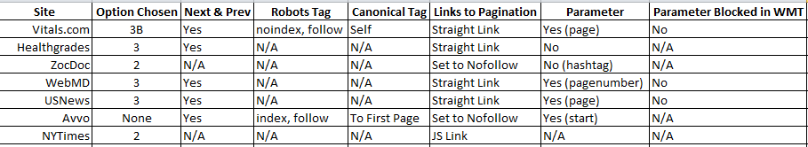 NYTimes and Zocdoc use Option 2 and blocked out all pagination pages from getting crawled and indexed. The other sites all use Option 3 with Vitals setting the robots tag on the pagination pages to “nofollow,index”. Avvo’s strategy is a combination of Option 1 with the canonical tag set to the primary page and Option 2 with the links to pagination tagged as “nofollow”. It is advisable not mix-up or combine the various strategies or risk sending wrong signals to the search engines.
