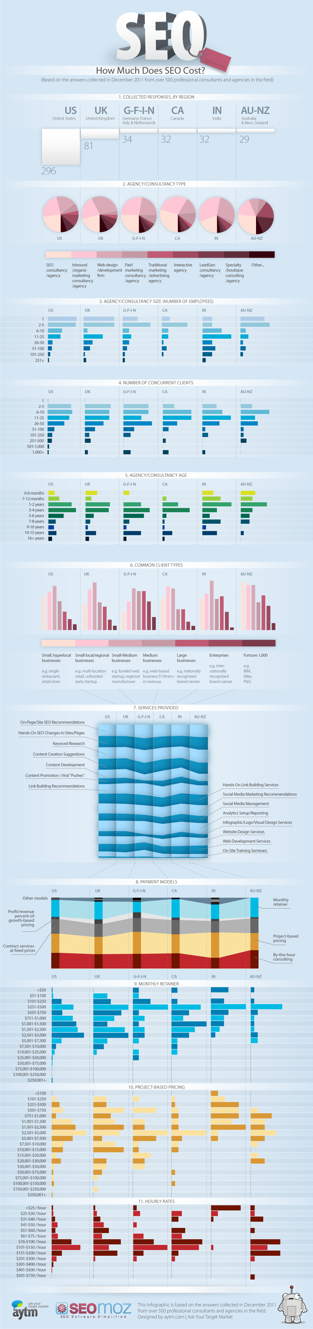 Obviously, this data is imperfect - SEOmoz is not a professional data surveying firm and our only tool was a basic list of questions on SurveyMonkey. That said, I'd be surprised if a professional surveyor found dramatically different data - there was enough participation to receive a trustworthy sample size and firms provided their personal/contact information (many of which I recognized while digging through the responses, but obviously will not be sharing identities publicly), which means we likely did not receive intentionally manipulative/misleading information. The data is provided below in three formats - first, some personal, high level takeaways from the survey, next an infographic from the great folks at AYTM Market Research and finally, a dump of the responses in CSV and Excel formats (without any personally identifiable info).