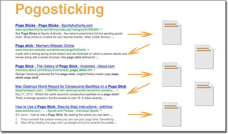Often called pogosticking, this refers to the behavior of users that click on a result, then "pogostick" back and forth between the search results and different websites, searching for satisfaction.